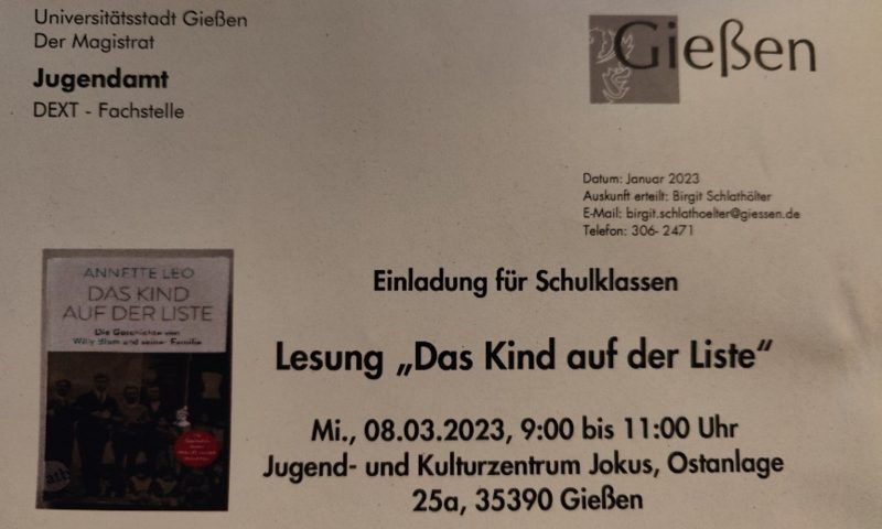 Am Mittwoch, dem 8. März 2023, besuchten die Klassen 10G, 10RA und 10RB im Jokus die Lesung des Buches „Das Kind auf der Liste“, geschrieben von Dr. Anette Leo. In dem Buch geht es um die Familie Blum und um das Verschweigen einer in der Zeit des Nationalsozialismus verfolgten Opfergruppe: die Sinti und Roma. Frau Dr. Leo erzählte von ihrer Recherchearbeit und las verschiedene Stellen aus ihrem Buch vor. Unterstützt wurde sie von dem Puppenspieler Peter Waschinsky. Familie Blum zog als Puppenspielerfamilie bis zu ihrer Verhaftung durch Süddeutschland und Herr Waschinsky konnte viel über diese Kunst erzählen. Er stellte zwischendurch Szenen aus dem Buch und Ausschnitte aus klassischen Puppenspielerstücken mit Marionetten nach.