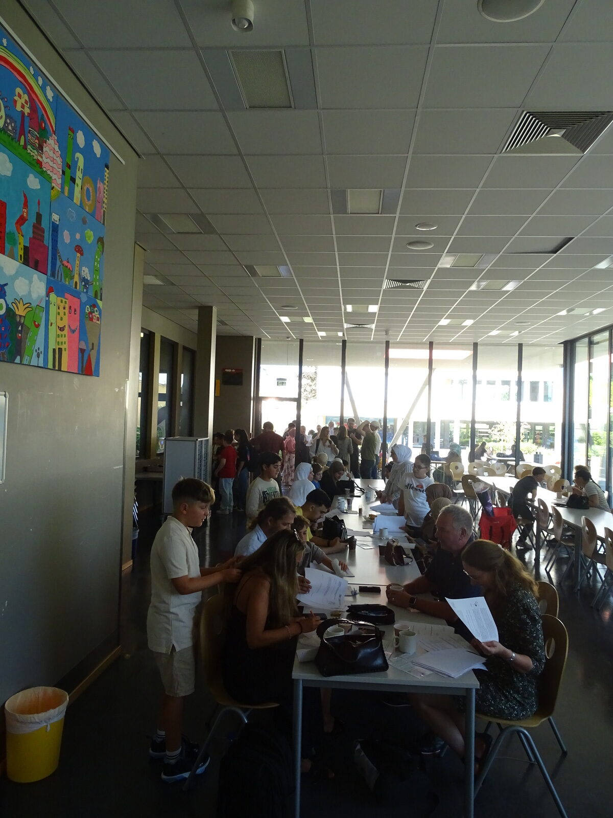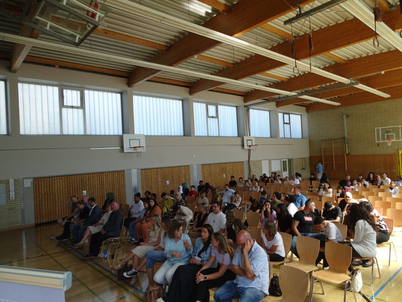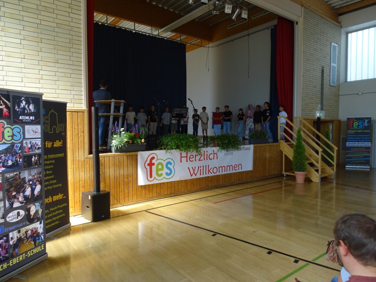 37 neue Schülerinnen und Schüler durfte Matthew George, der neue Schulleiter der FES, am 19. August in der Sportschule begrüßen. Unter der Leitung von Angelika Mera-Euler und Marisa Klein werden die Förderstufenklassen 5 zu Beginn des Schuljahres die FES und viele neue Fächer kennenlernen. Nach einem offiziellen Teil, der von Schülerinnen des Jahrgangs 7 und Leonard Wagner musikalisch umrahmt wurde, folgte ein Infoteil für die Eltern sowie das Elterncafe. So erhielten alle neben vielen Informationen auch einen Eindruck vom Können des FES-Caterers „Schmegge lasse“.