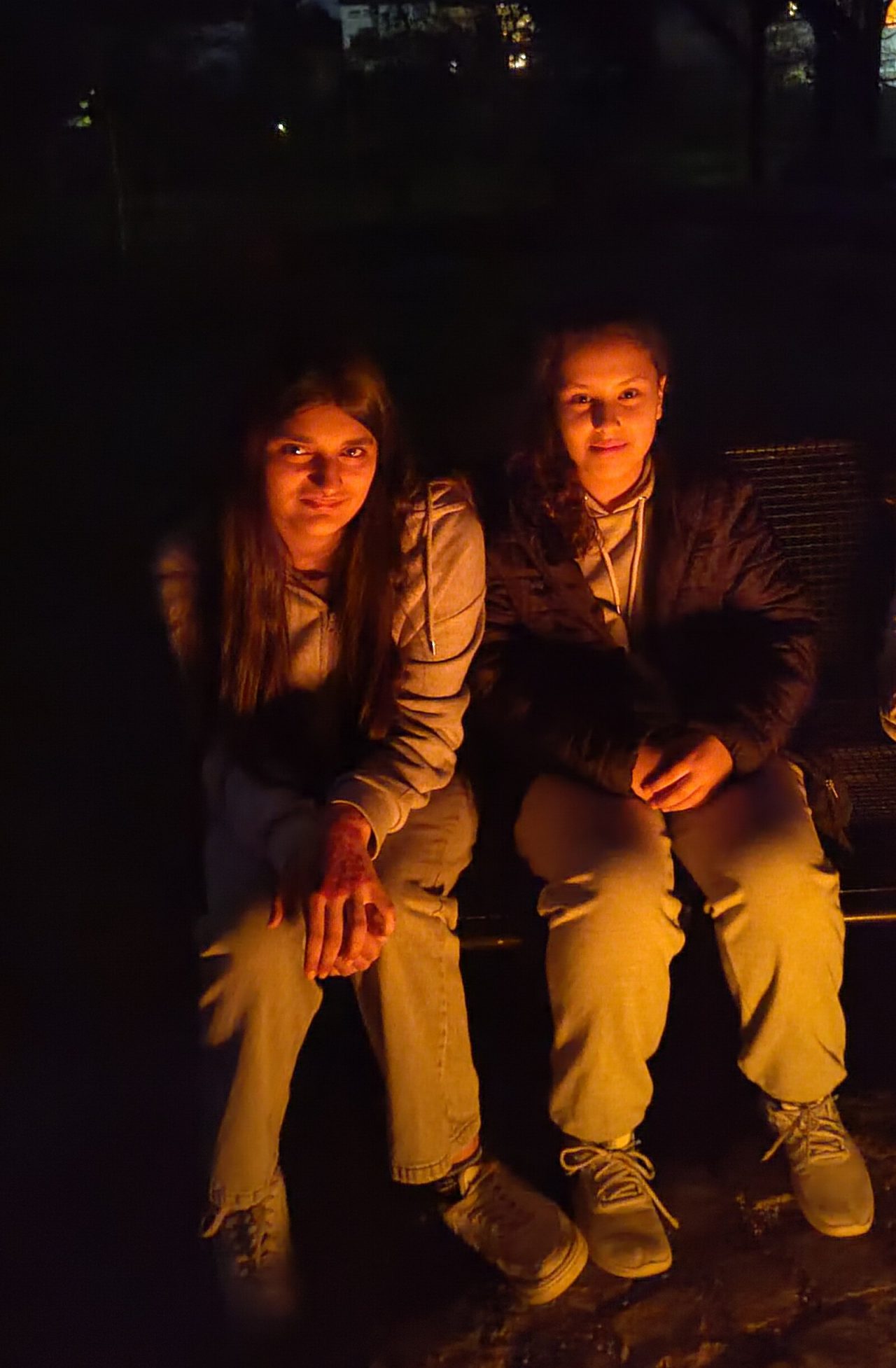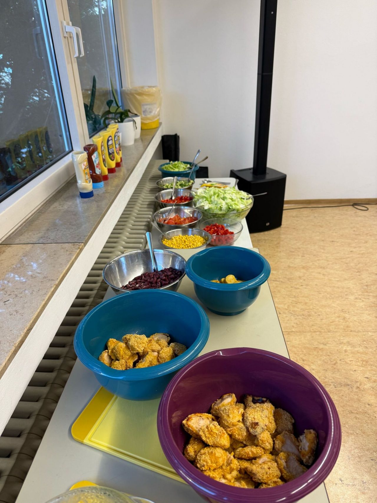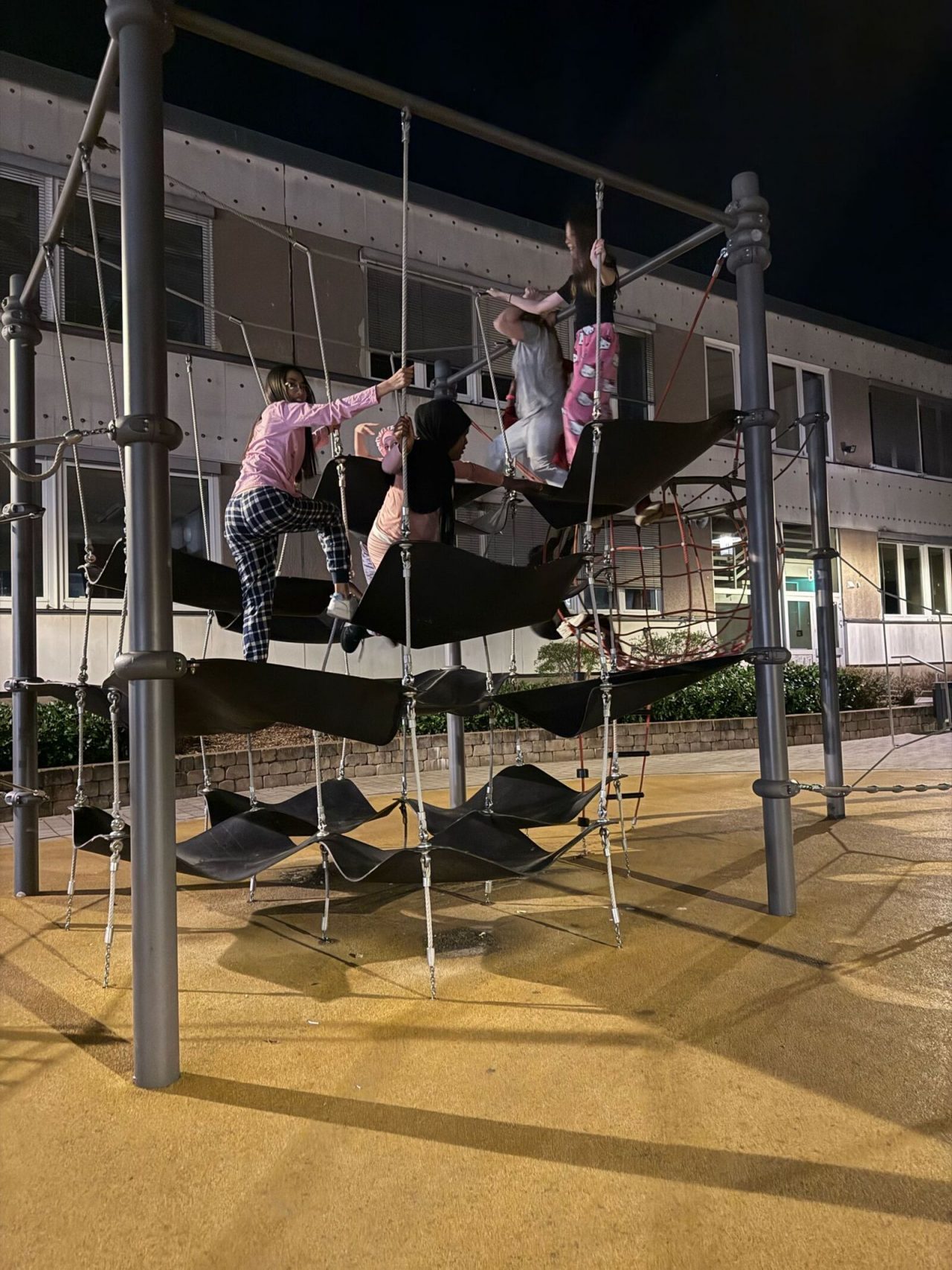 „Am Anfang waren wir draußen und haben Fußball gespielt, dann haben wir unsere Sachen im Partykeller abgestellt. Die Mädchen waren leider mehr als die Jungs und durften im größeren Musikraum schlafen. Wir hatten auch Süßigkeiten dabei und wir durften unsere Handys benutzten, solange grade kein Programm war. Als die eine Gruppe ein Spiel gespielt hat, hat die andere Gruppe das Abendessen vorbereitet. Übrigens haben Renaz, Artem, Amin und Muskan aus den 9.+10. Klassen geholfen. Die waren voll nett. Zum Abendessen hatten wir Wraps, Nuggets, Gemüse, Salat, und Vegane Nuggets. Lustig war, als Amin seinen Wrap so voll gemacht hat, dass er ihn nicht zusammenrollen konnte und alle lachen mussten 😂😂 Wir haben auch eine Nachtwanderung gemacht. Die Leute, die nicht mitkommen wollten, sind in der Schule geblieben und haben für den Abend alles vorbereitet, z.B. das Lagerfeuer anmachen, Tische putzen usw. Beim Lagerfeuer durften wir Zauberpulver ins Feuer werfen und dabei sagen, was wir an dem Tag toll fanden. In der Nacht mussten die Jungs ein paar Mal durch die Schule wandern und sich einen neuen Ort zum Schlafen suchen. Erst waren wir im Partykeller, da ging das Licht aber nicht aus. Dann haben wir in einem Raum in der Turnhalle geschlafen. Da waren aber so viele Spinnen, dass wir dann nochmal mitten in der Nacht in einen Gruppenraum gewechselt sind.