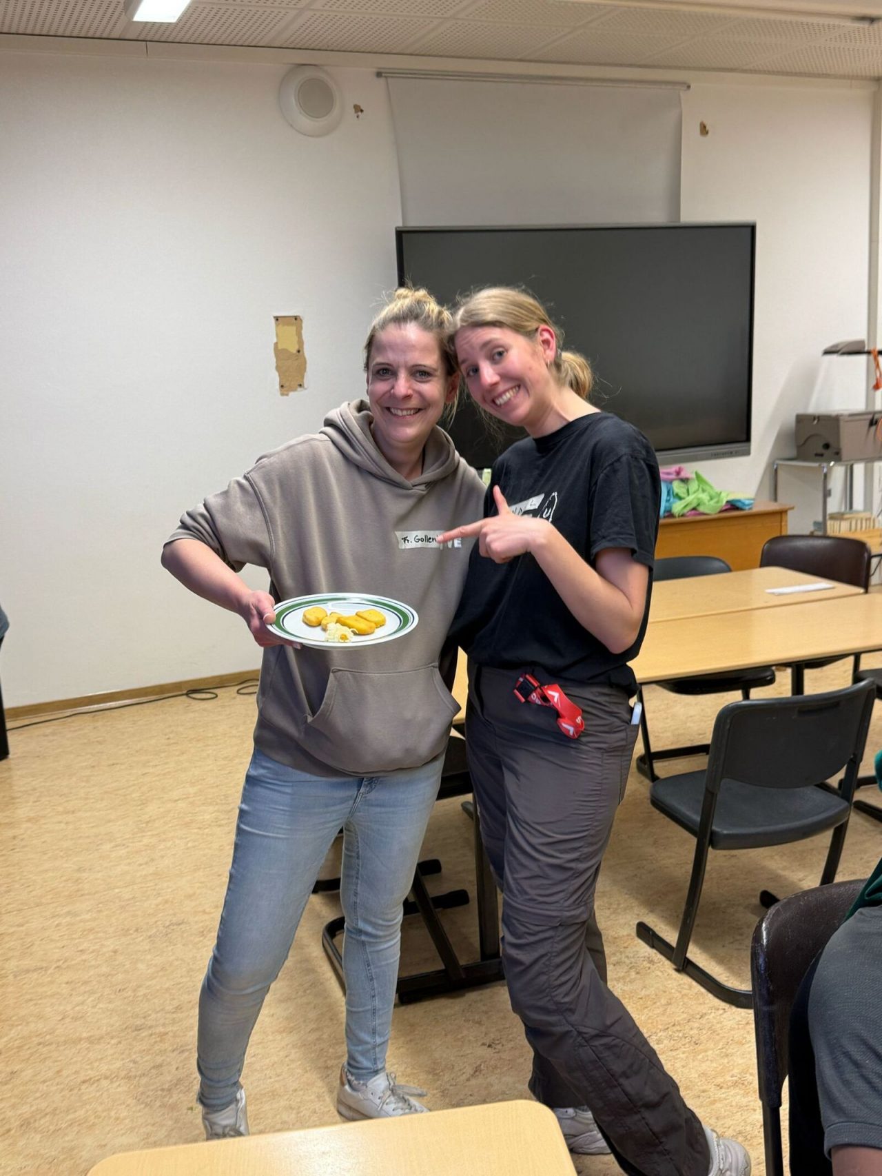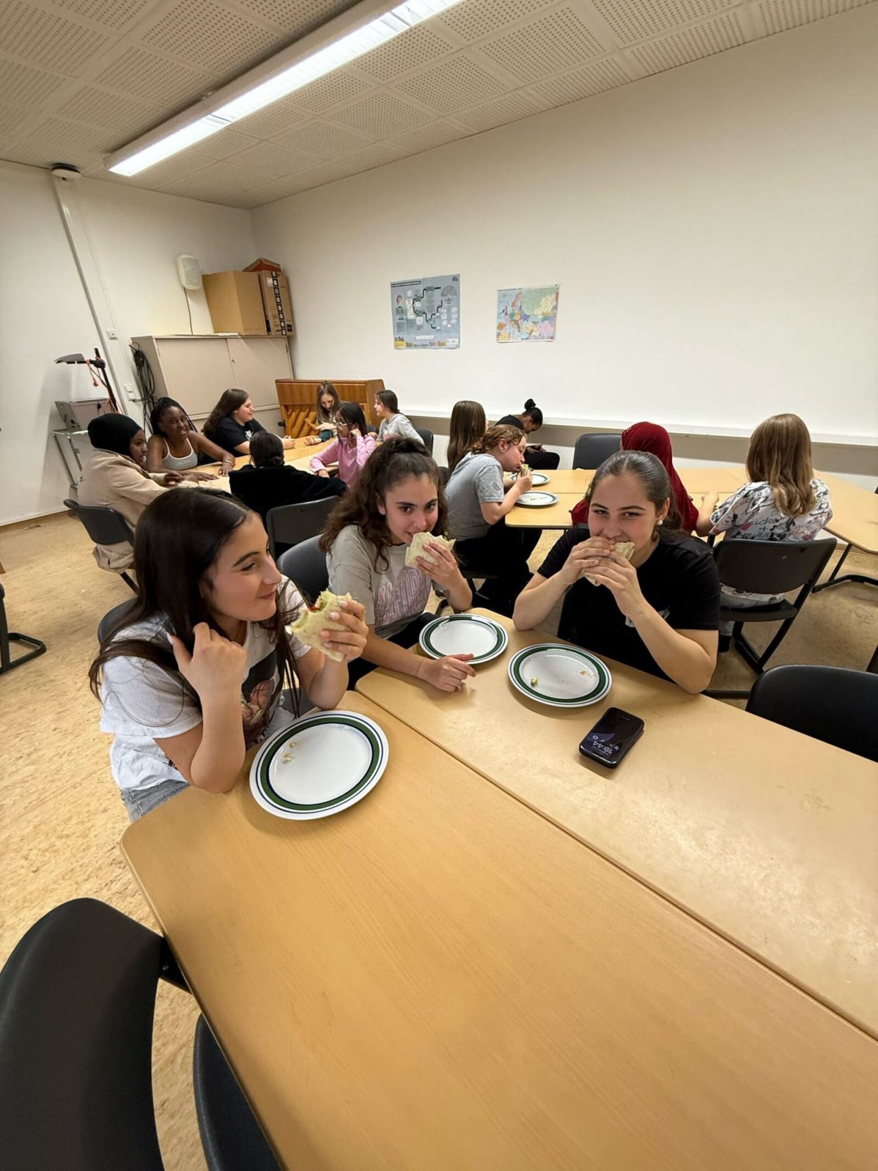 Am Morgen haben wir gefrühstückt. Es gab Nutella, Brötchen, Butter, Kakao usw. Wir hatten auch einen ,,Getränkestand“, da waren Getränke in so nem Behälter und da konnte man halt was zu trinken holen. Nach dem Frühstück sind wir ganz normal zur Schule gegangen. Alle waren etwas müde, aber wir hatten ja nur 3 Stunden Schule. Das einzige Negative war, das sie uns mit morgens mit Musik geweckt haben😑 Aber es hat auf jeden Fall Spaß gemacht.“
