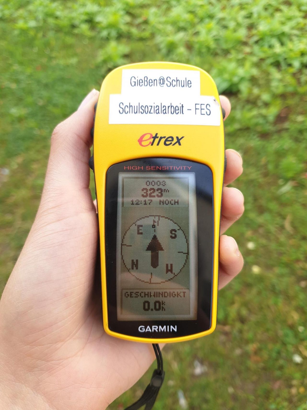 „Wir haben uns in 3 Gruppen aufgeteilt. Jeder hat mit einer anderen Nummer angefangen. Mit dem GPS-Gerät haben wir geguckt, wo das Rätsel ist. Zum Beispiel musste man bei Station 4 beim GPS-Gerät die 4 eingeben und auf einem Zettel stand noch ein Tipp. Bei der 4 musste man ein Schild mit einem Fußballspieler mit rotem Trikot suchen und sagen, welche Nummer es hatte. Natürlich war es beim TSG-Wieseck und der Spieler hatte die Nummer 7. Bei dem GPS-Gerät sieht man es so wie auf Foto 1 und nur wenn der Pfeil gerade ist, dann ist es die richtige Richtung. Als alle fertig waren, haben wir uns nochmal in der Schule getroffen. Dann hat Frau Wall die Zettel korrigiert, ob es die richtigen Zahlen waren, denn wenn man eine Aufgabe richtig hatte, hat man eine Zahl rausbekommen. Am Ende haben wir den Schatz im Schulgarten gesucht und B. hat ihn gefunden. Es war sehr toll!“ [Janine F., 05Fb]