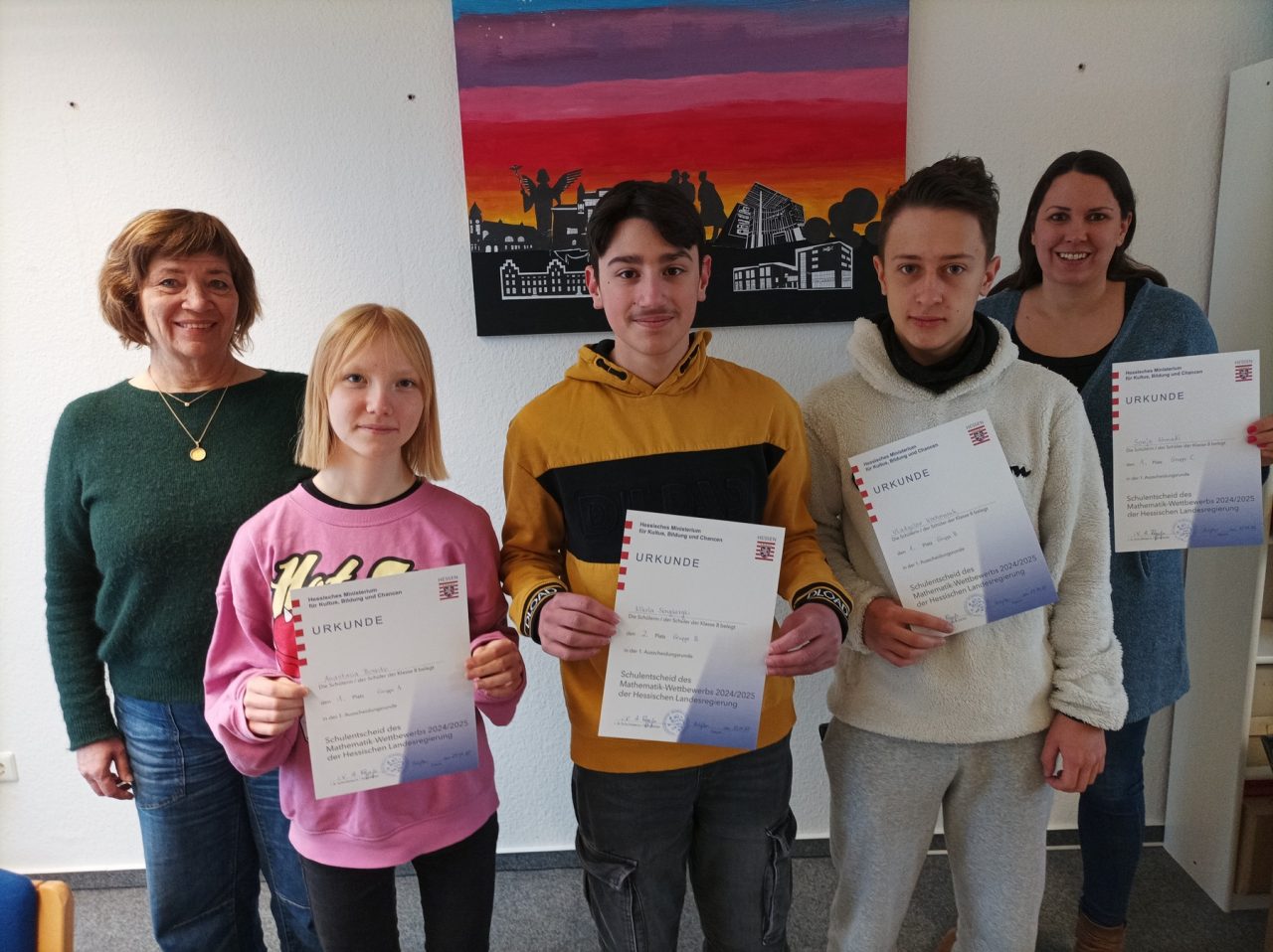 In einer kurzen Feierstunde ehrten die stellvertretende Schulleiterin Annegret Roggenkamp sowie die Fachleiterin Mathematik, Florentine Hartl, die Sieger des Mathematikwettbewerbs 2024/25. Hartl überreichte neben den obligatorischen Urkunden auch ein kleines Präsent an die Gewinner, die die Farben der FES nun in der nächsten Runde auf Kreisebene vertreten dürfen. Wir wünschen dabei viel Erfolg. Es siegten:
