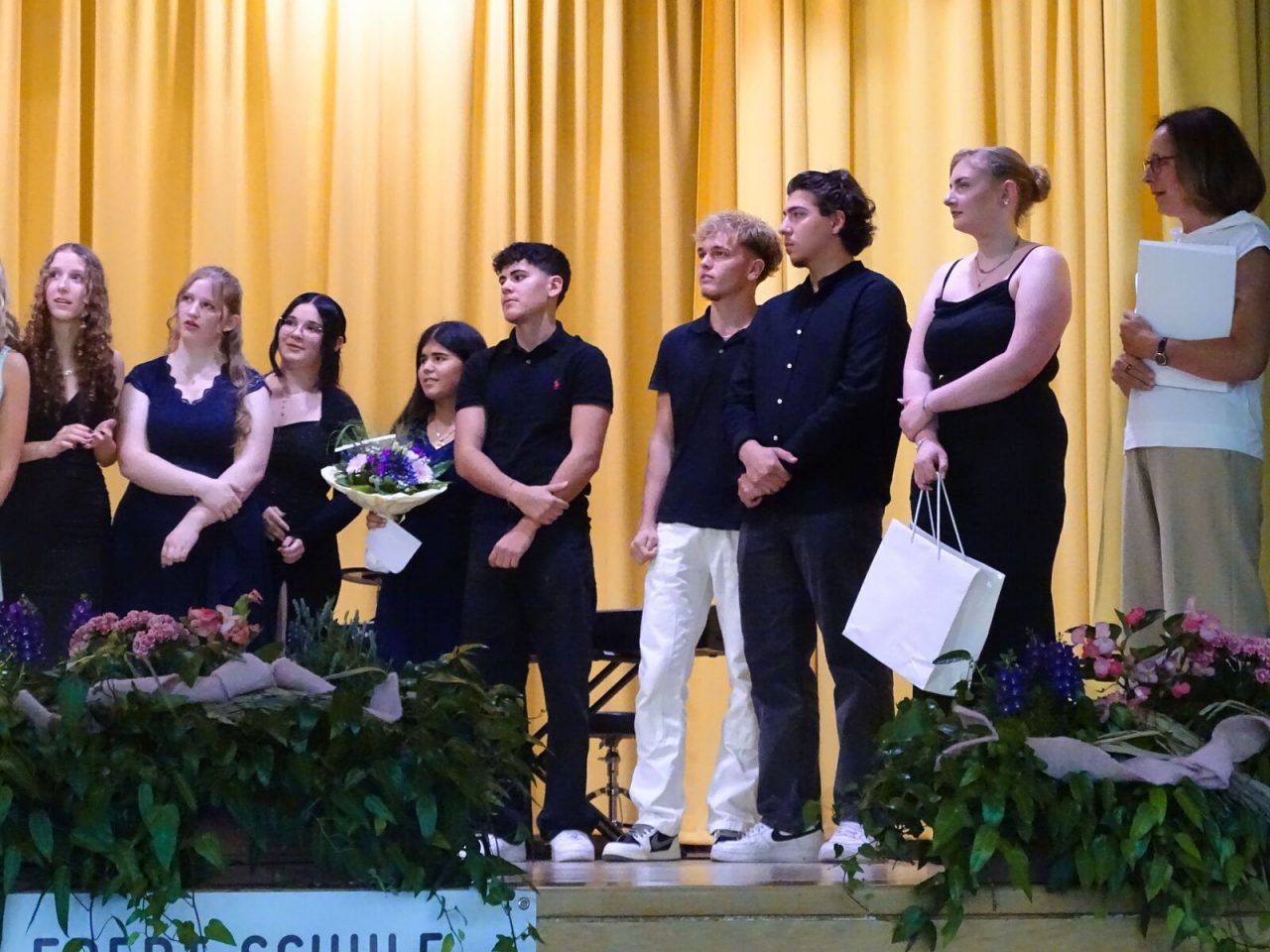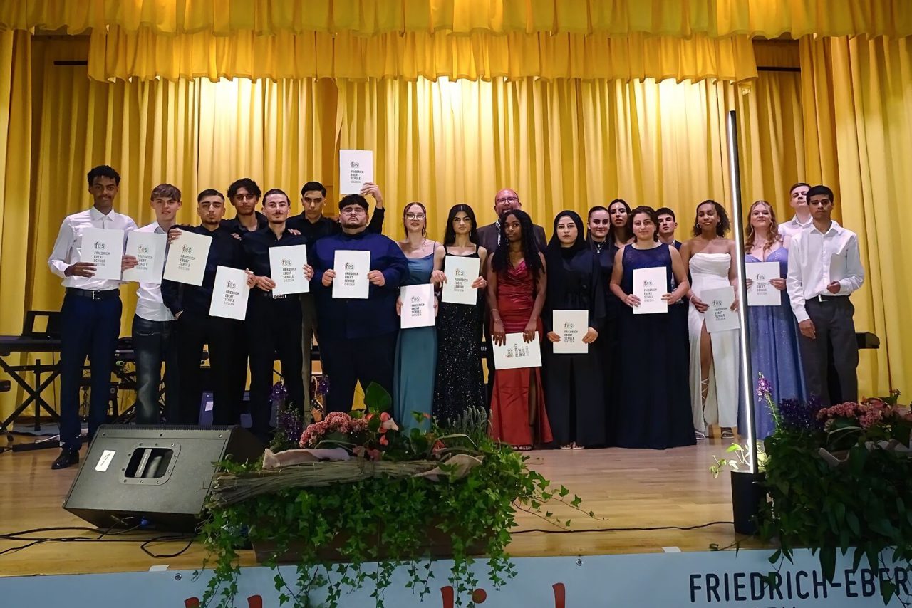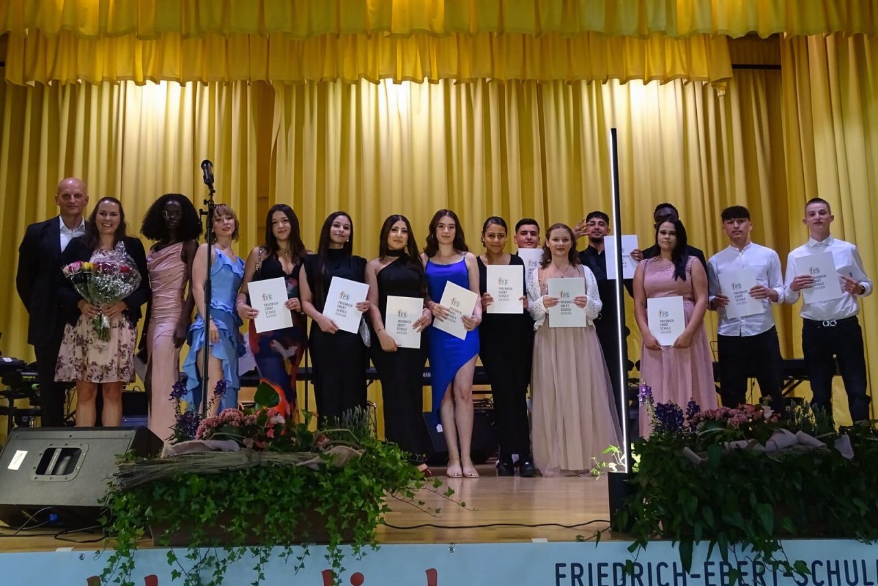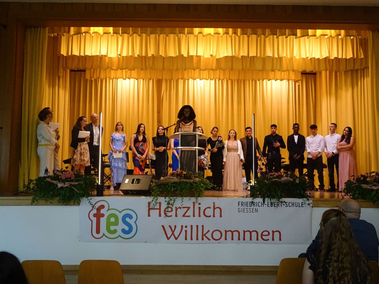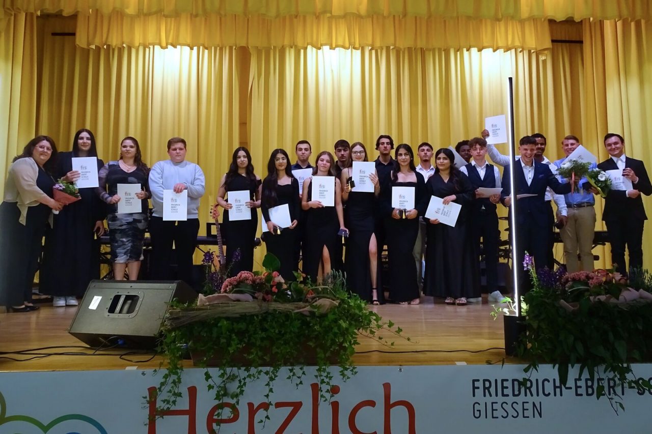 „Wer friert uns diesen Moment ein – besser kann es nicht sein“ – mit diesen Zeilen aus Andreas Bouranis Song „Auf uns“ begann die feierliche Zeugnisvergabe der Friedrich-Ebert-Schule Gießen im Bürgerhaus Wieseck. Den glänzenden Augen vieler Abgänger war die Bedeutung dieses Abends anzusehen – besser konnte es für manche Absolventen nicht sein. So erhielten 80 Schülerinnen und Schüler ihr Zeugnis aus den Händen ihrer Klassenlehrkräfte, wobei 27 von 60 Haupt- und Realschülern einen qualifizierenden Abschluss erreichten. Alle 20 Schülerinnen und Schüler der Gymnasialklasse schafften den Übergang in die gymnasiale Oberstufe. Zu Beginn des Festakts lobte die stellvertretende Schulleiterin Annegret Roggenkamp den reibungslosen Verlauf des Abschlussstreiches, der am Morgen der Zeugnisvergabe stattgefunden hatte. Dies zeuge von Verantwortungsbewusstsein und Verlässlichkeit – Kompetenzen die die Abgänger auch auf ihrem weiteren Lebenslauf von Nutzen seien. Zum Abschluss der Veranstaltung erhielten die Klassenbesten eine besondere Auszeichnung aus den Händen von Andrea Stump-Schmidt, der Vorsitzenden des Fördervereins. Geehrt wurden Mario Fahmi Bibo (9Ha), Mustafa Sohrabi (9Hb), Kemal Tarik Karapirli (10Ra), Yodit Mengstab Kidane (10Rb) und Alena Karakoc (10Ga). Des Weiteren erhielten Schulsprecherin Durin Yüsün sowie ihr Stellvertreter Marcel Eckhardt eine besondere Würdigung von SV-Lehrer Andrej Ziegler. Musikalisch umrahmt wurde der Abend vom MSP-Kurs um Leonard Wagner, der die Stücke „Somewhere only we know“ von Keane und „Golden Heart“ von JVKE performte.