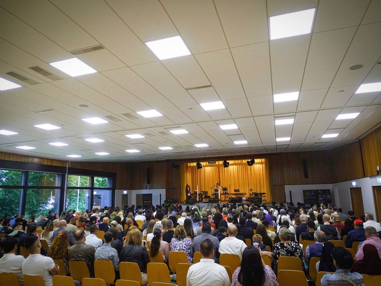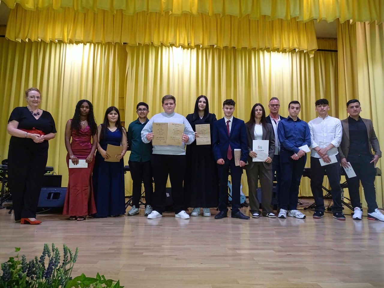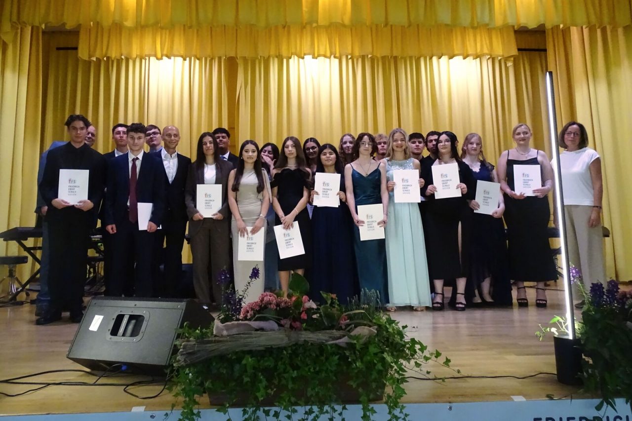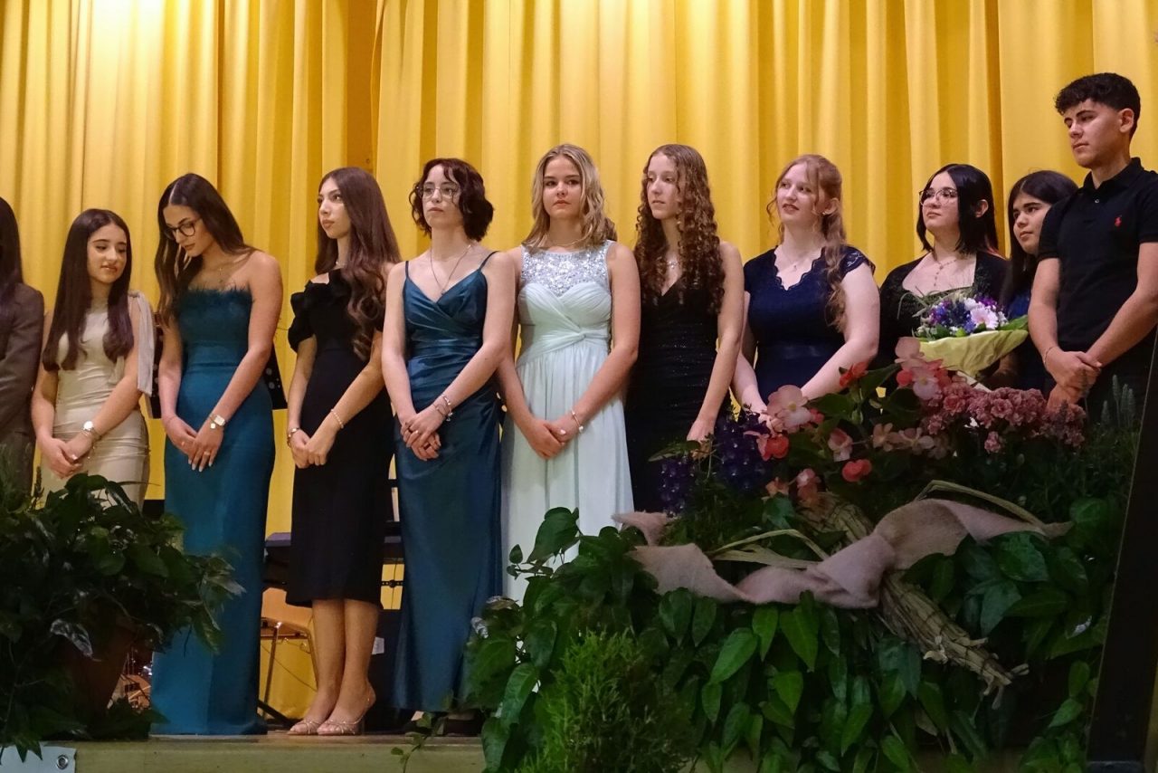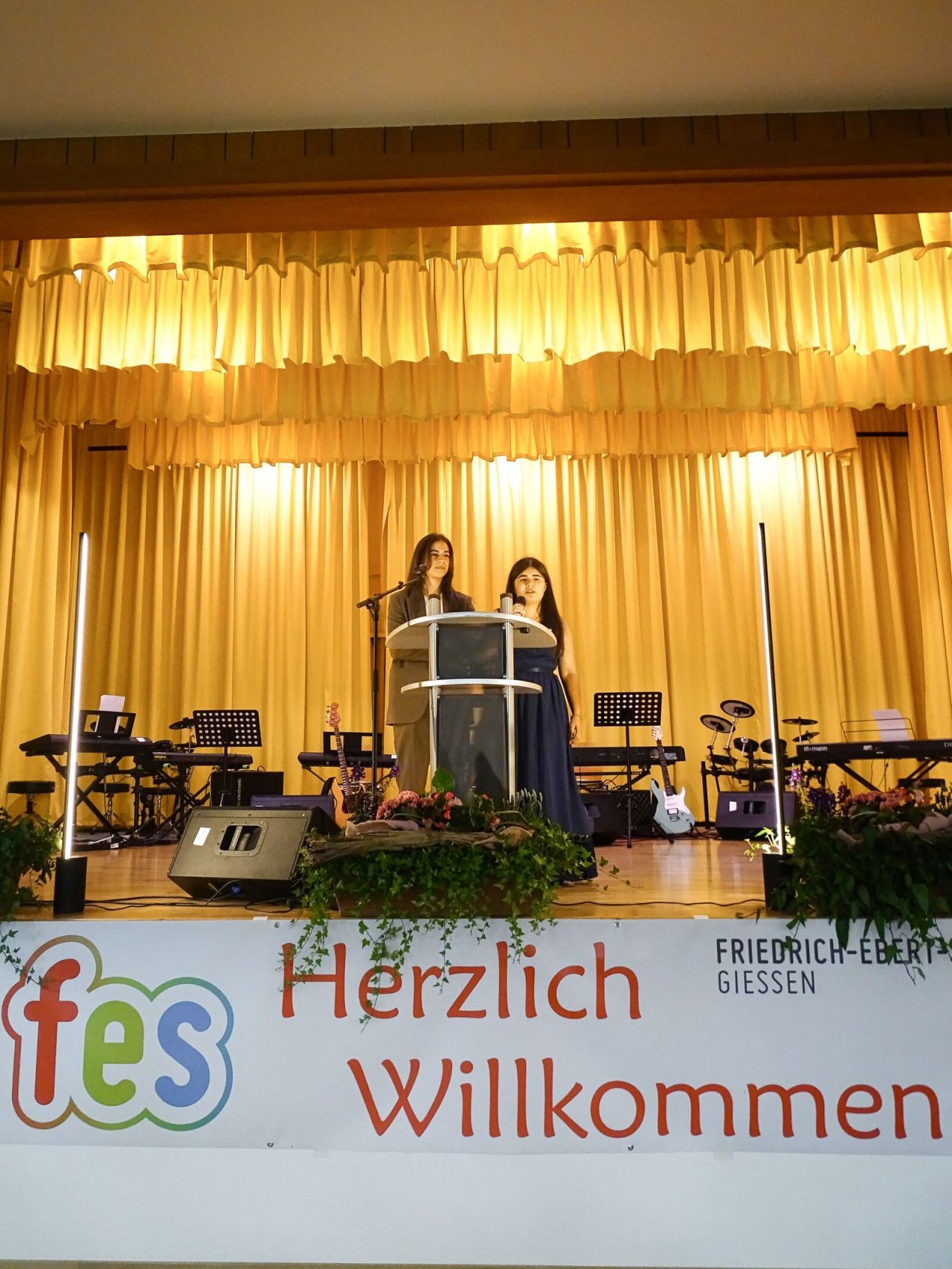 „Wer friert uns diesen Moment ein – besser kann es nicht sein“ – mit diesen Zeilen aus Andreas Bouranis Song „Auf uns“ begann die feierliche Zeugnisvergabe der Friedrich-Ebert-Schule Gießen im Bürgerhaus Wieseck. Den glänzenden Augen vieler Abgänger war die Bedeutung dieses Abends anzusehen – besser konnte es für manche Absolventen nicht sein. So erhielten 80 Schülerinnen und Schüler ihr Zeugnis aus den Händen ihrer Klassenlehrkräfte, wobei 27 von 60 Haupt- und Realschülern einen qualifizierenden Abschluss erreichten. Alle 20 Schülerinnen und Schüler der Gymnasialklasse schafften den Übergang in die gymnasiale Oberstufe. Zu Beginn des Festakts lobte die stellvertretende Schulleiterin Annegret Roggenkamp den reibungslosen Verlauf des Abschlussstreiches, der am Morgen der Zeugnisvergabe stattgefunden hatte. Dies zeuge von Verantwortungsbewusstsein und Verlässlichkeit – Kompetenzen die die Abgänger auch auf ihrem weiteren Lebenslauf von Nutzen seien. Zum Abschluss der Veranstaltung erhielten die Klassenbesten eine besondere Auszeichnung aus den Händen von Andrea Stump-Schmidt, der Vorsitzenden des Fördervereins. Geehrt wurden Mario Fahmi Bibo (9Ha), Mustafa Sohrabi (9Hb), Kemal Tarik Karapirli (10Ra), Yodit Mengstab Kidane (10Rb) und Alena Karakoc (10Ga). Des Weiteren erhielten Schulsprecherin Durin Yüsün sowie ihr Stellvertreter Marcel Eckhardt eine besondere Würdigung von SV-Lehrer Andrej Ziegler. Musikalisch umrahmt wurde der Abend vom MSP-Kurs um Leonard Wagner, der die Stücke „Somewhere only we know“ von Keane und „Golden Heart“ von JVKE performte.